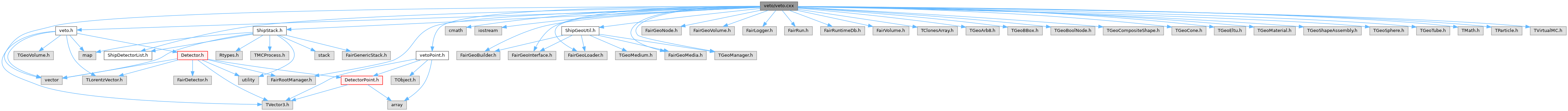 This file contains the definitions for the Veto class used in the FairShip Software. The class is responsible for simulating the Decay Vessel(helium) + integrated SBT geometry and interactions.